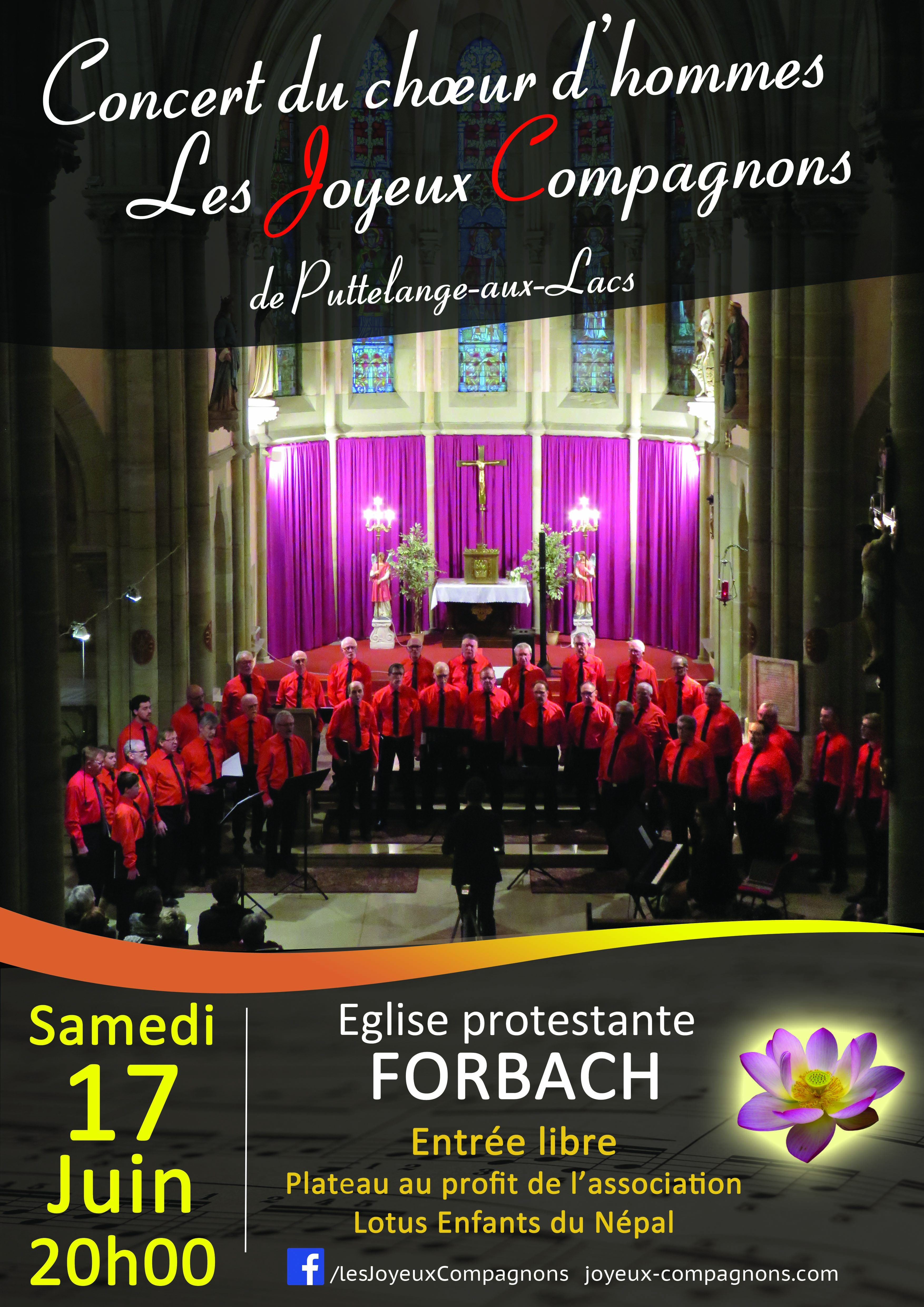 Le chœur d’hommes les Joyeux Compagnons, de Puttelange-aux-Lacs, se produira à l’église protestante de Forbach, le samedi 17 juin 2017 à 20h00, pour un concert de solidarité, organisé par l’association locale « Lotus – Enfants du Népal ». L’objectif de cette association est d’améliorer les conditions de vie d’enfants népalais abandonnés ou en grande difficulté et de leur donner le droit de vivre dignement. Les dons récoltés lors du concert seront reversés en totalité à cette association, à but humanitaire. Le chœur d’hommes proposera un programme de chants variés, avec de nouvelles pièces acquises récemment. Le public voyagera entre les classiques de Verdi et Mendelssohn, des gospels aux consonances africaines, des traditionnels mais aussi des chants de variété afin de satisfaire un large public.