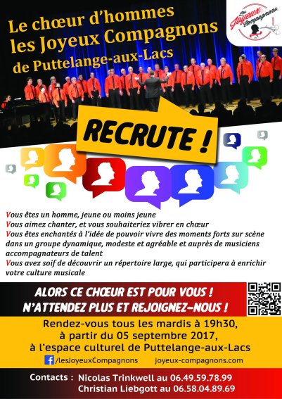 Le chœur recrute ! Publié le 22 juin 2021 par choeurhommes Poster un commentaire Le chœur d’hommes RECRUTE ! Vous aimez chanter et vous voulez vivre des moments forts sur scène dans un groupe dynamique ? Alors rejoignez-nous ! N’hésitez pas à nous contacter pour plus d’infos. Partager :TweetJ’aime chargement… Similaire