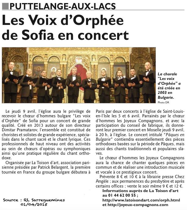 Article publicitaire sur le concert avec « Les Voix d’Orphée » – Sofia, Bulgarie, du mercredi 1er avril 2015 :